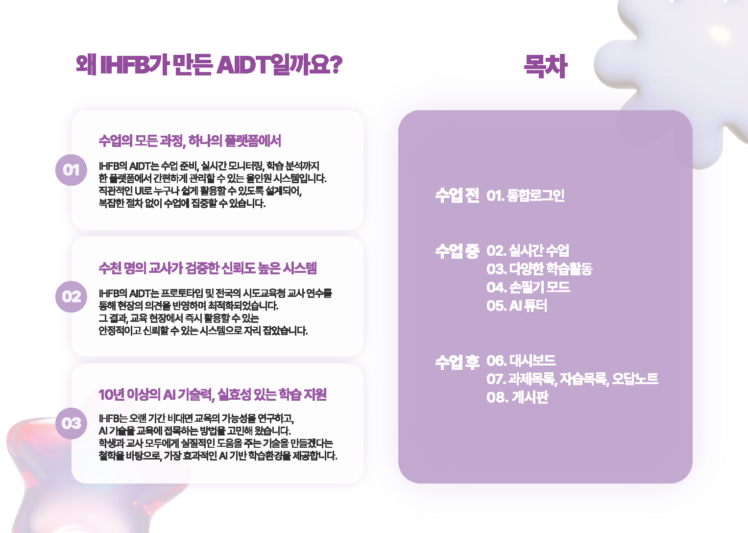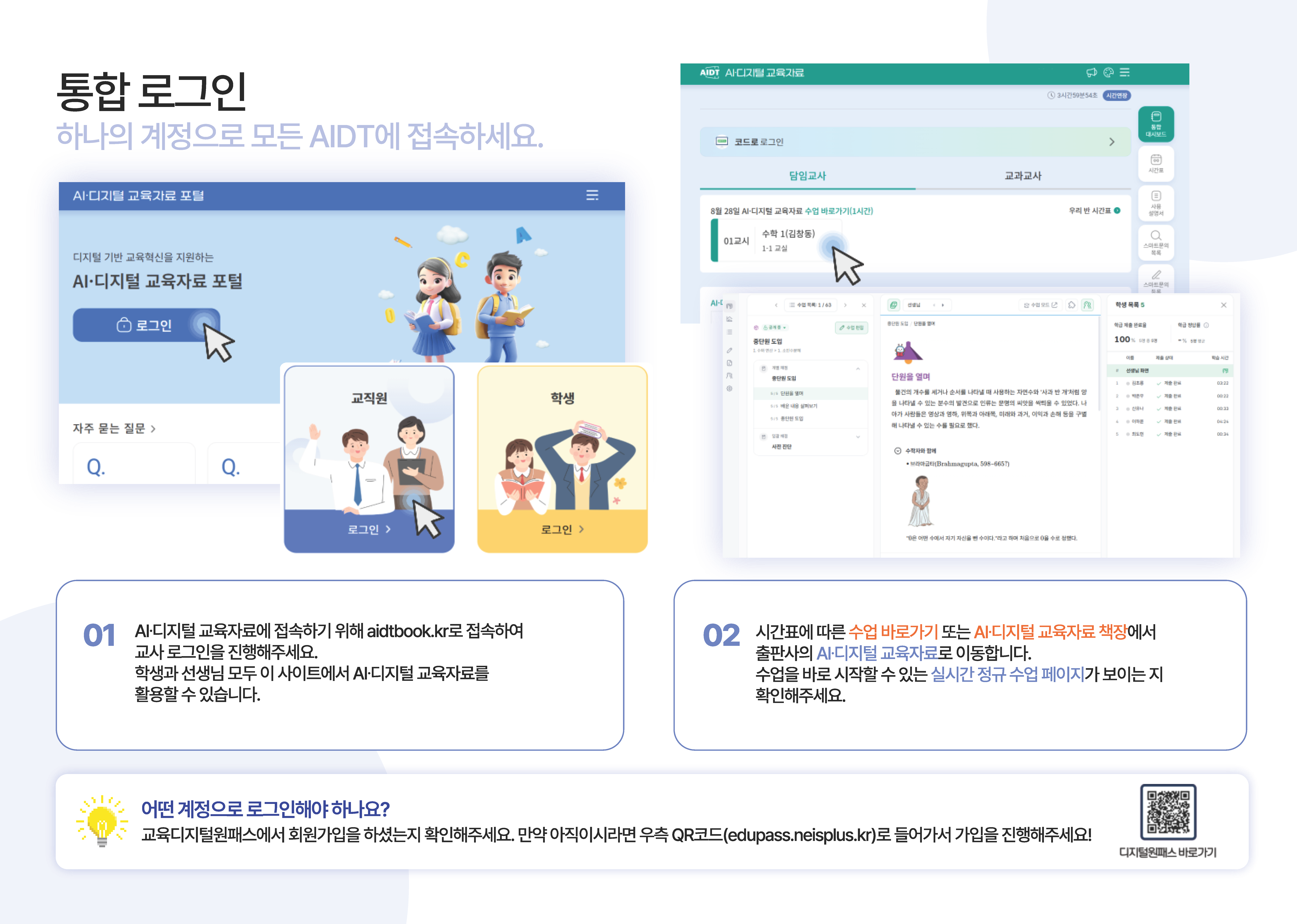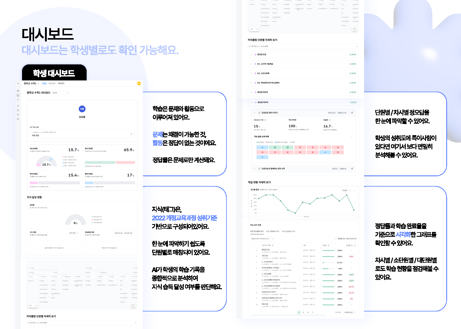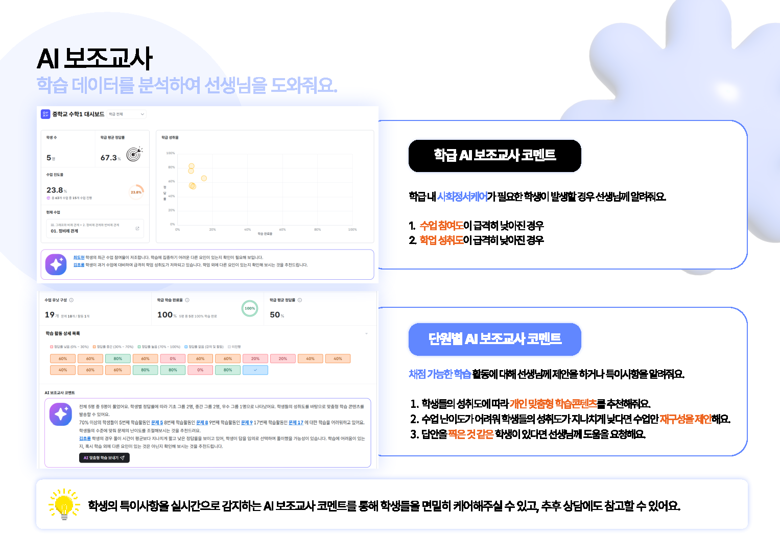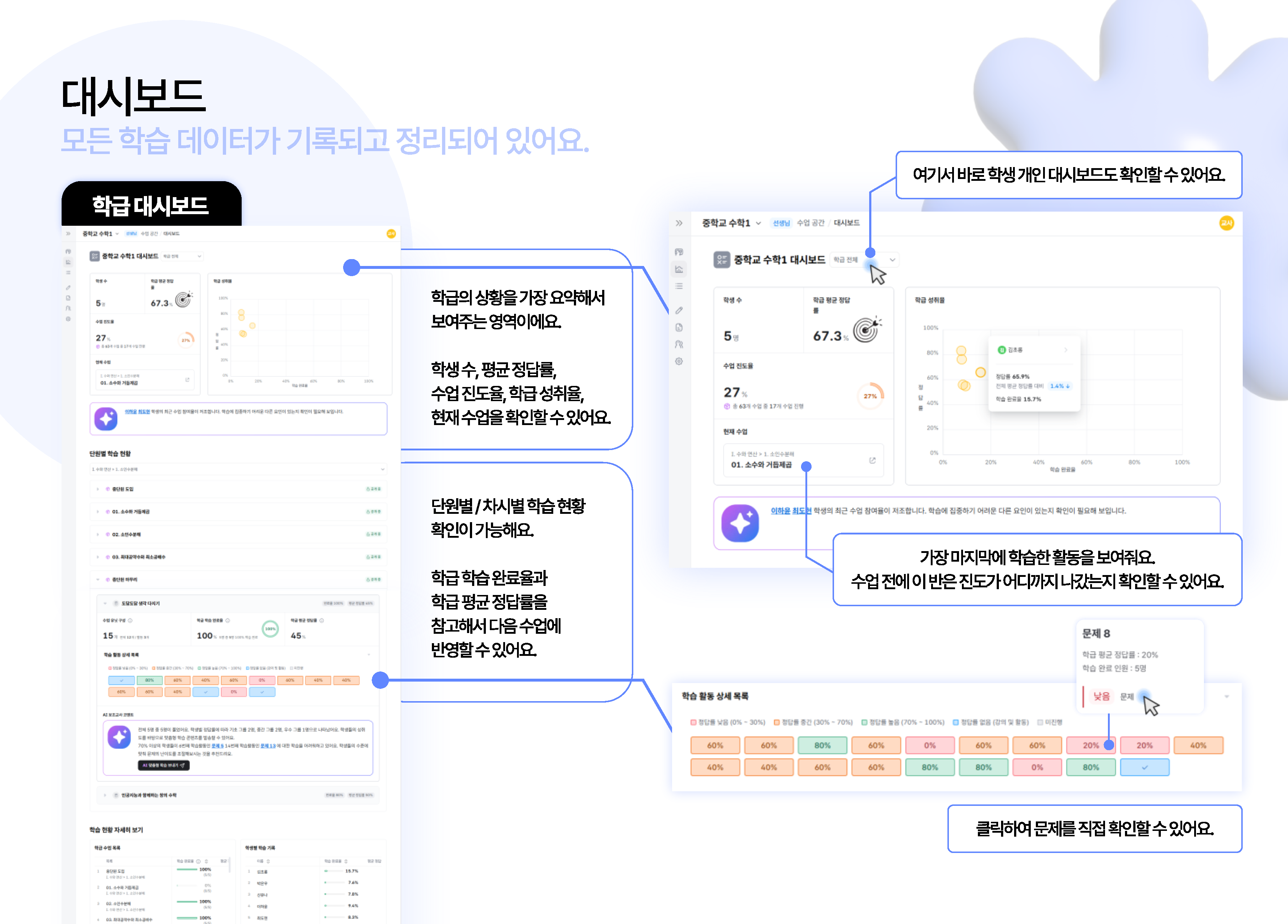 - 선생님은 대시보드에서 학급 전체의 학습 진행 상황을 한눈에 볼 수 있고, 학생은 자신의 학습 데이터를 세부적으로 확인할 수 있습니다. 학생은 대시보드의 정보를 바탕으로 최적의 학습 경로를 찾을 수 있고, 선생님은 AI가 분석한 데이터를 바탕으로 맞춤형 수업 설계와 지도가 가능합니다.
