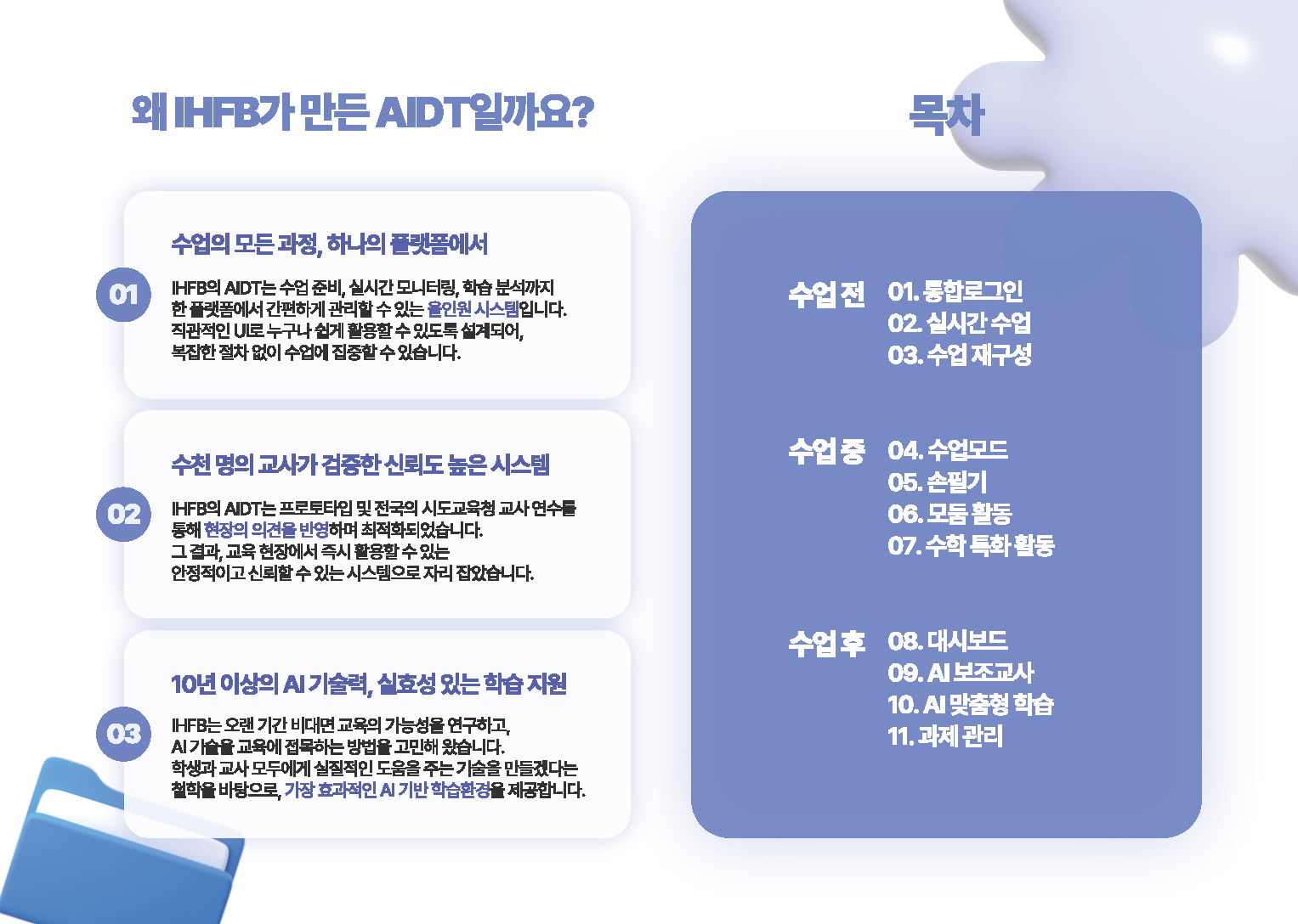 - AI•디지털 교육자료의 장점은 자동으로 채점이 되고, 학습 데이터가 실시간으로 쌓인다는 점입니다. 교사가 이러한 학습 데이터를 일일이 확인하고 분석하는 것은 현실적으로 어렵습니다. AI 보조교사는 학생들의 학습 데이터를 분석하여, 선생님이 놓칠 수 있는 부분을 알려 주어 더욱 효과적인 맞춤형 교육이 가능합니다.