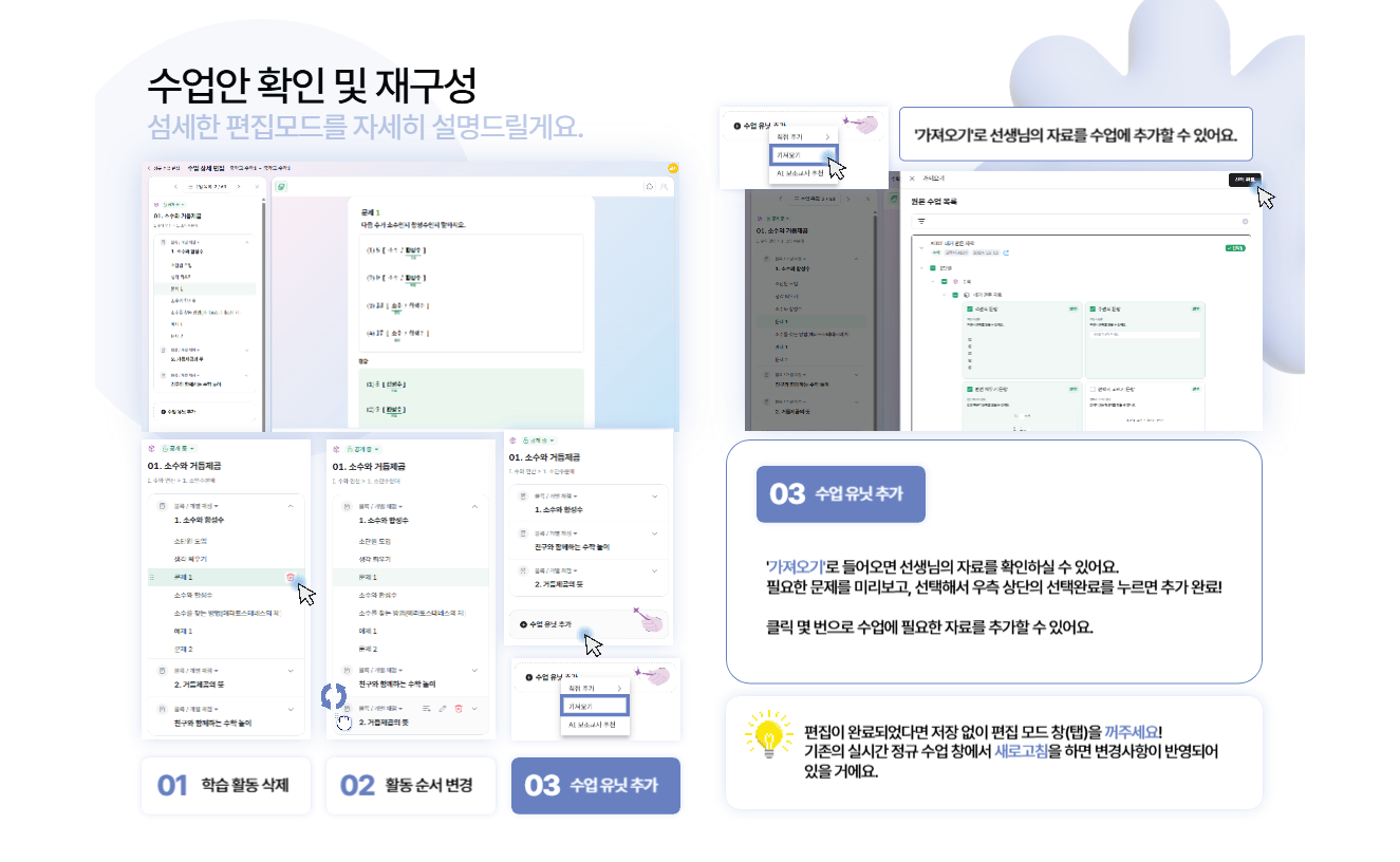 - 수업 전에 개인별 학습 진단을 통해 학습자에게 부족한 부분을 정확히 분석합니다. 그리고 진단 결과에 따라 개인 맞춤형 학습 콘텐츠를 제공하여 느린 학습자들도 적극적으로 수업에 참여할 수 있도록 돕습니다.