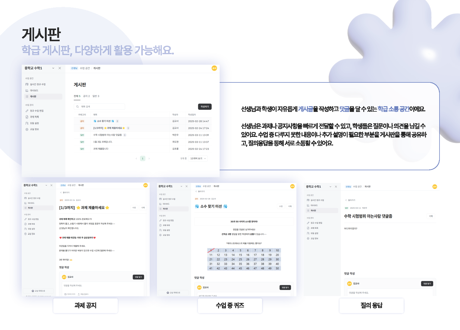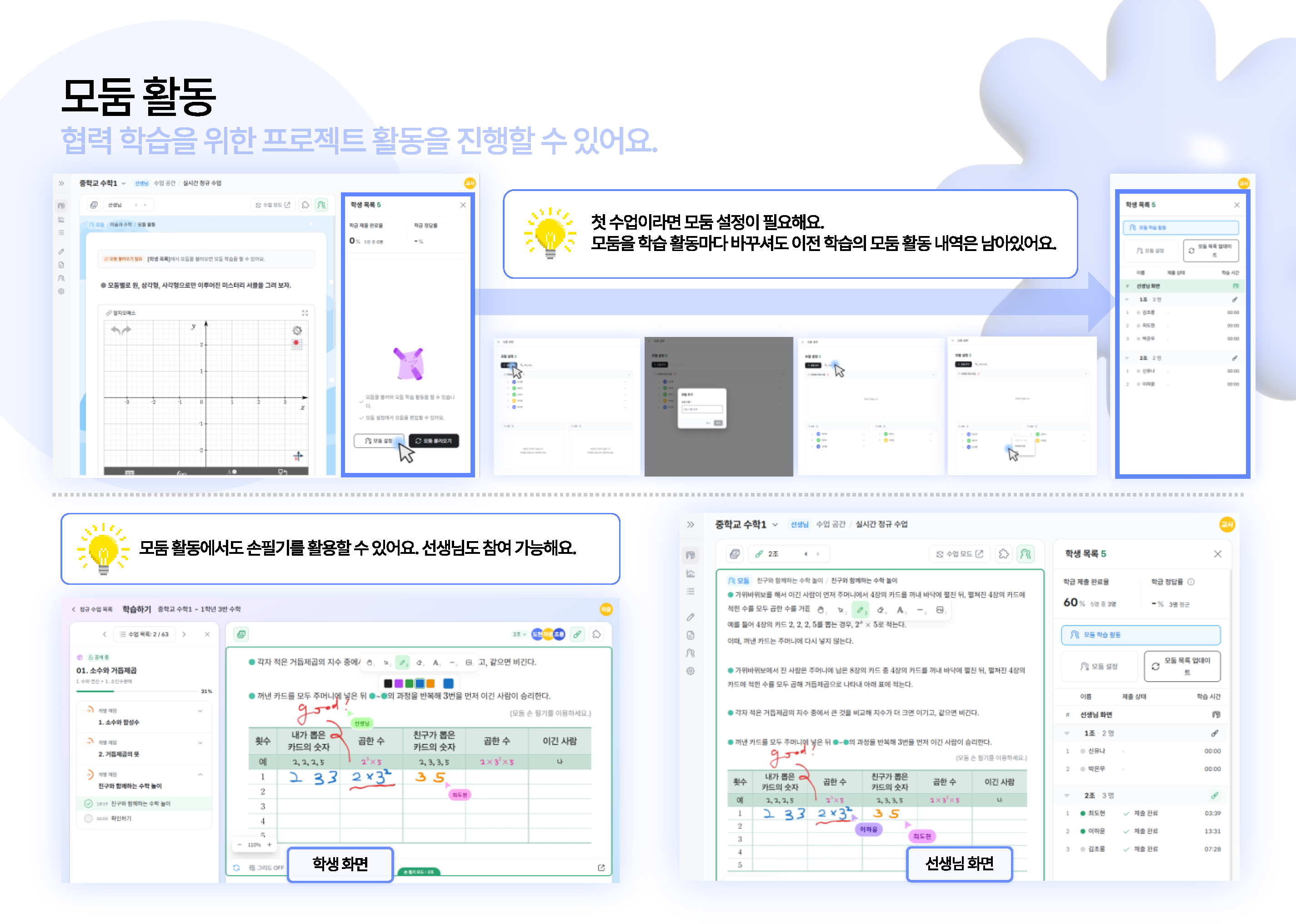 - 학급의 모둠을 설정하여 토의·토론을 통한 협력 학습이나 프로젝트 학습을 진행할 수 있습니다. 학생들이 적극적으로 수업에 참여하여 서로 협력을 통해 성장할 수 있는 다양한 기회를 제공합니다.
