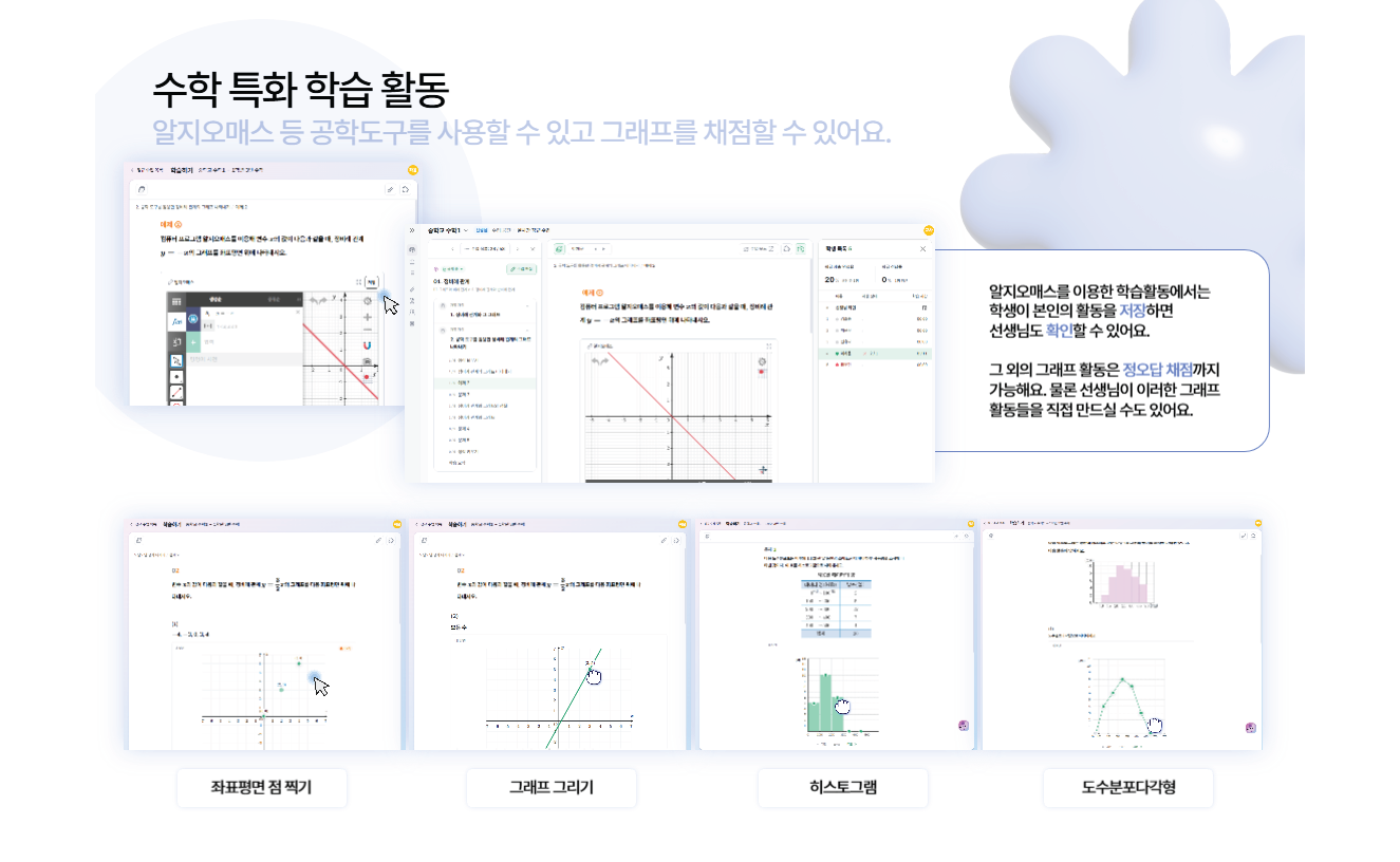 - 교과서에 알지오매스, 통그라미, 이지통계 등 다양한 공학 도구가 탑재되어 있습니다. 좌표평면, 그래프, 통계 차트까지! 다양한 공학 도구를 활용하여 수학을 더욱 쉽고 재미있게 학습할 수 있습니다.